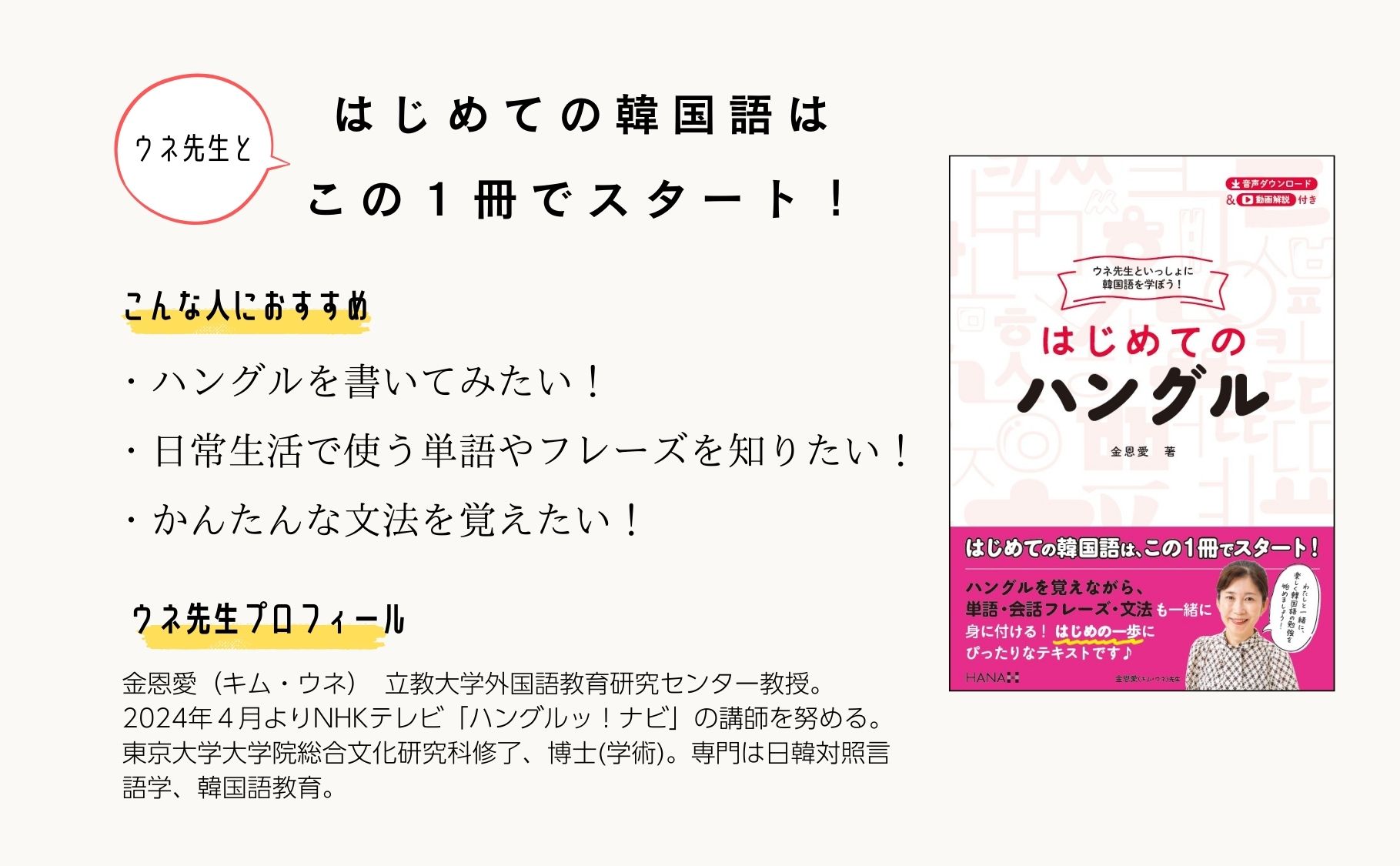 2024年度NHK「ハングルッ!ナビ」(NHKテレビ ハングル講座)の講師に就任した金恩愛先生の入門書です。 ハングルの文字と発音、そしてすぐに使える入門単語&フレーズを、豊富なイラストと共に丁寧にやさしく学ぶことができます。