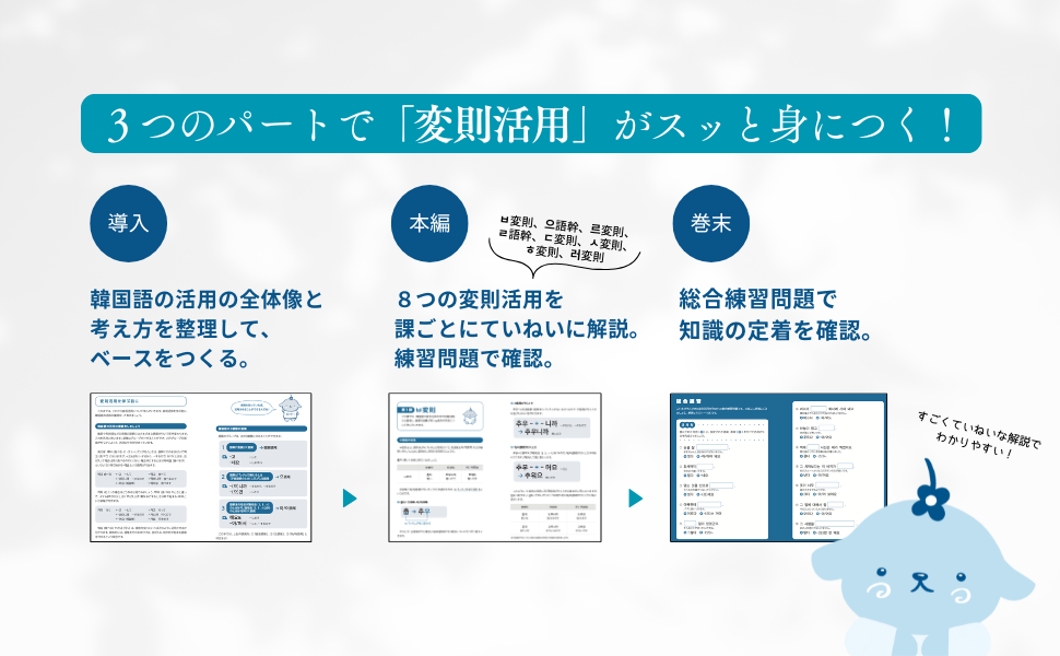 「導入」「本編」「巻末」の3パート構成で、基礎から仕上げまで段階的に学べます。扱うのは8つの変則活用(ㅂ変則、으語幹、르変則、ㄹ語幹、ㄷ変則、ㅅ変則、ㅎ変則、러変則)。それぞれを丁寧に解説し、説明の途中にも確認問題を挟んでいるので、理解した内容をその場でチェックしながら着実に定着させられます。