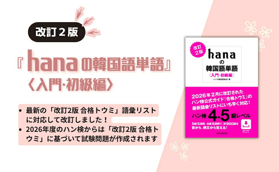 刊行以来、多くの韓国語学習者に支持されてきた『hanaの韓国語単語〈入門・初級編〉』が、最新の「改訂2版 合格トウミ」語彙リストに対応して改訂しました。