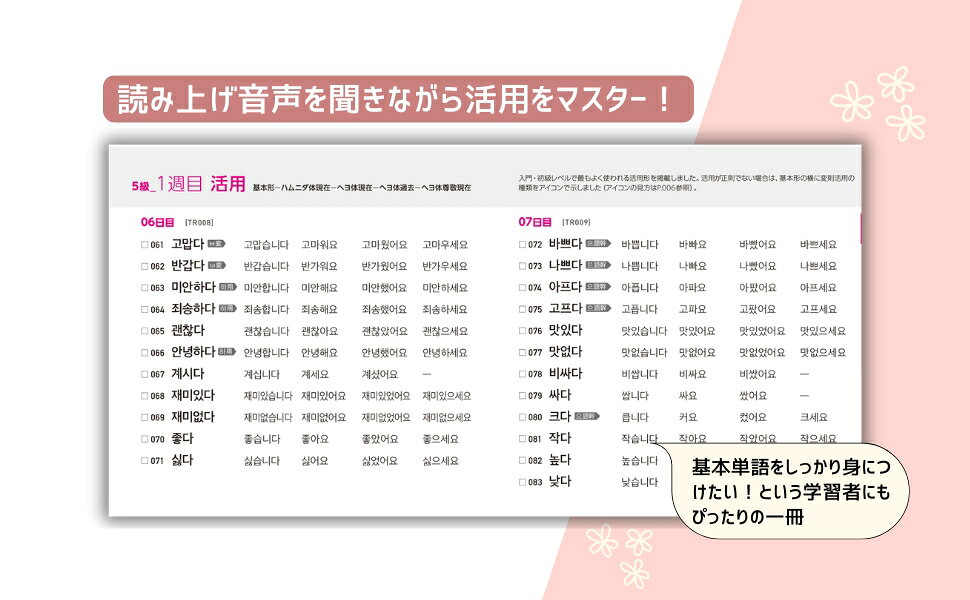 見出し語はもちろん、例文の中で表記と発音が異なる箇所には、すべて発音通りのハングルをフォローし、すべての例文の音声をダウンロード提供します。