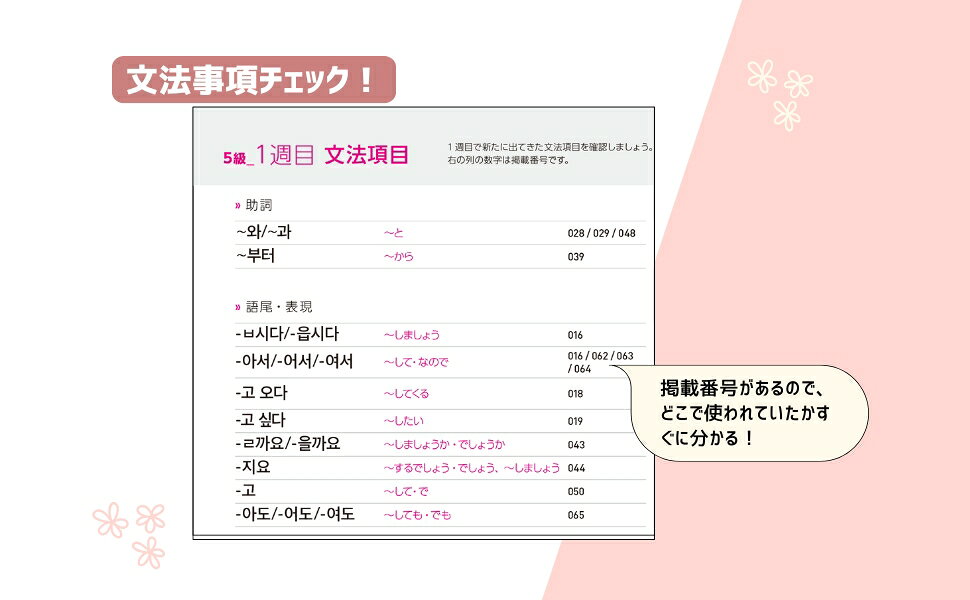 例文は、ハン検4・5級の語彙と文法を中心に作成した、短くてすぐに会話で使えるもの。
