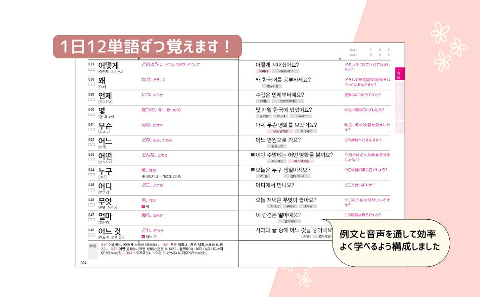 さらに、「見出し語のみ音声」「見出し語訳のみ音声」「見出し語+例文訳音声」が弊社サイトよりダウンロード可能になっており、音読、シャドーイング、リピーティングから、クイックレスポンス、瞬間韓作文など、さまざまな練習方法を実践することが可能です。まさに「音から単語を学ぶ」単語集と言えます。
