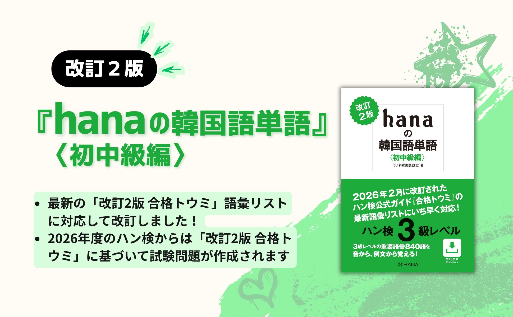 刊行以来、多くの韓国語学習者に支持されてきた『hanaの韓国語単語〈初中級編〉』が、最新の「改訂2版 合格トウミ」語彙リストに対応して改訂しました。