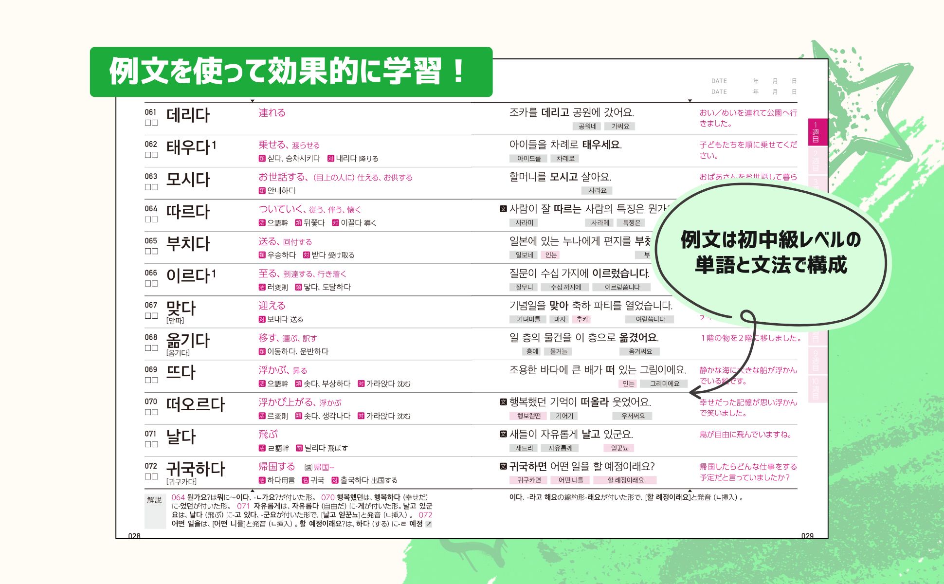 試験を受ける人だけでなく、入門を終えて語彙力をさらに伸ばしたい人にもおすすめです!例文も、初中級レベルの単語と文法で作られています。全ての例文に音声が用意されているので、耳からも覚えることができます。