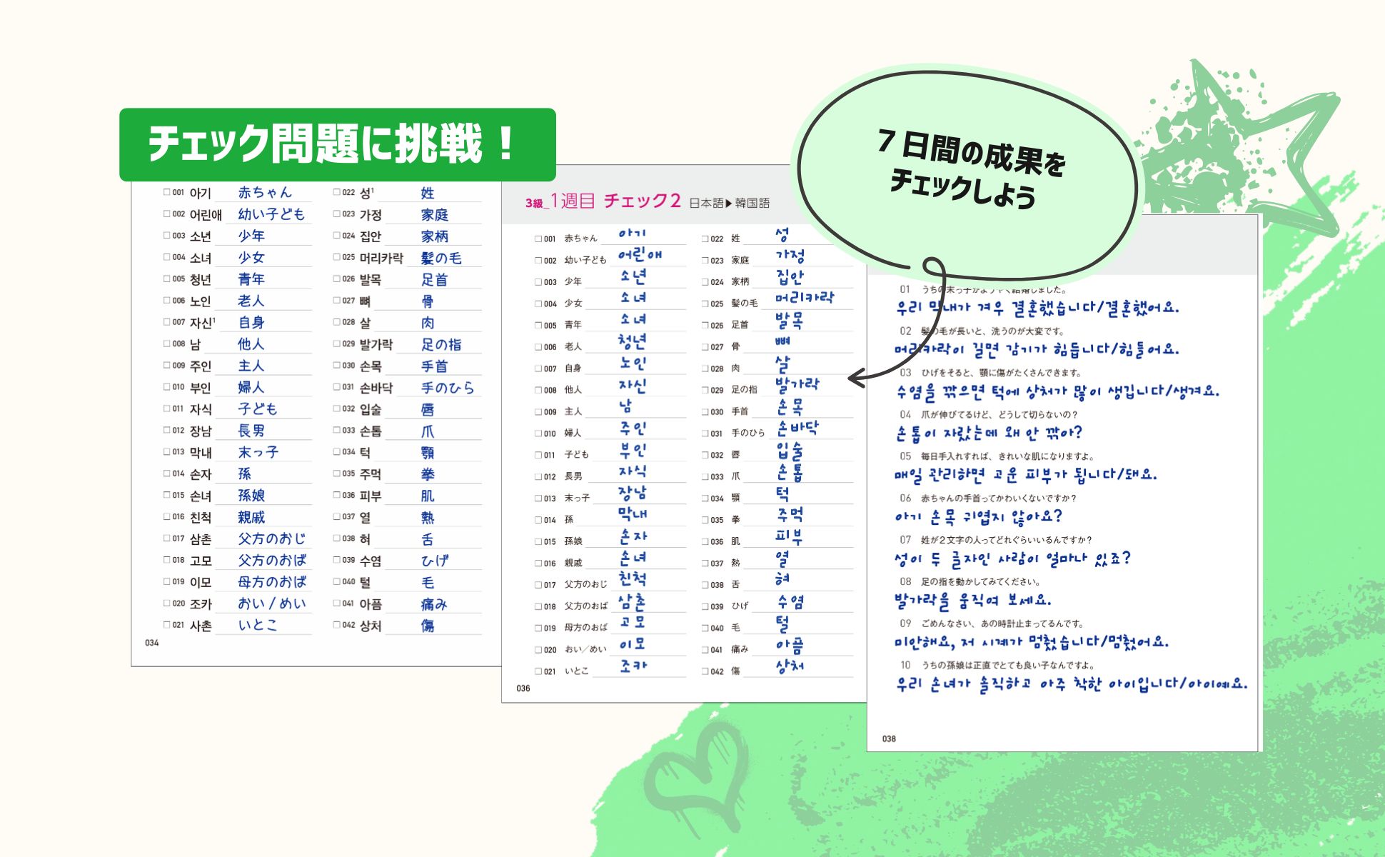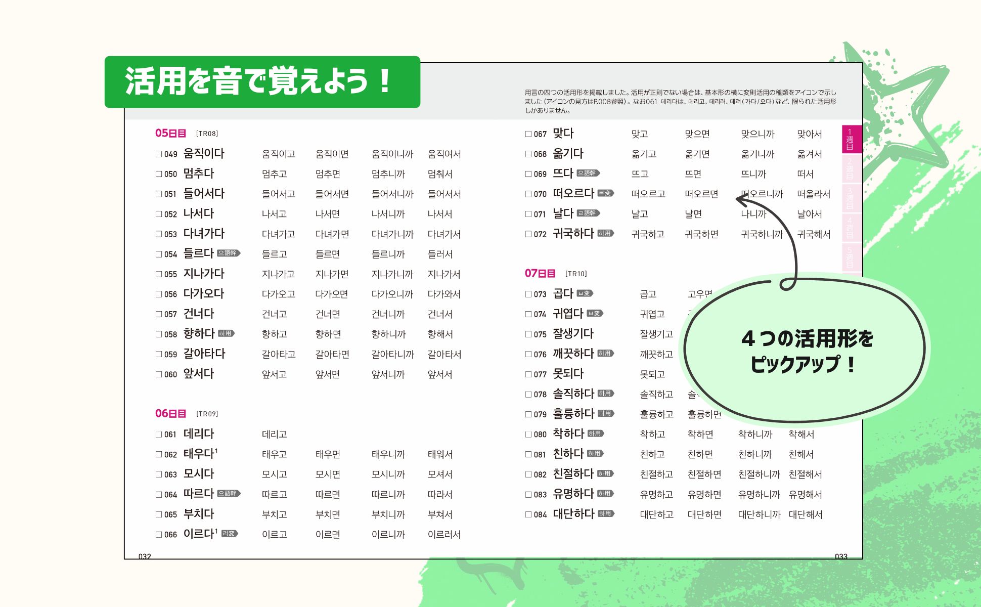 さらに、「見出し語のみ音声」「見出し語訳のみ音声」「見出し語+例文訳音声」が弊社サイトよりダウンロード可能になっており、音読、シャドーイング、リピーティングから、クイックレスポンス、瞬間韓作文など、さまざまな練習方法を実践することが可能です。まさに「音から単語を学ぶ」単語集と言えます。