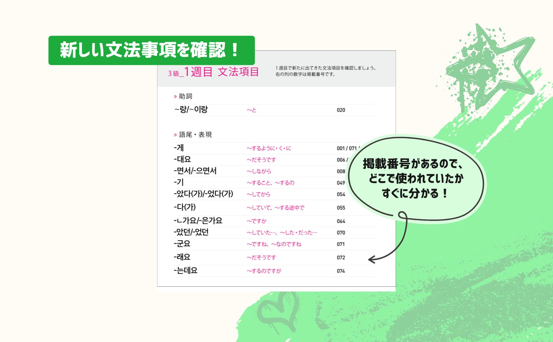 週の終わりに、その週の例文で新たに使われた文法事項をまとめています。覚えきれていないものがあったら、再度例文に戻ってみましょう。掲載番号があるので、どこで使われていたかすぐに分かります。
