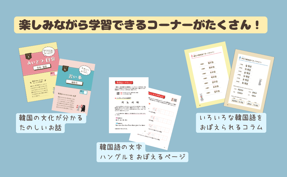 韓国の文化を知ることができるお話や、韓国語の文字の基本が分かるコーナー、もっと韓国語を知りたいと思ったときに読めるコラムなど、楽しい韓国語がぎゅっと一冊の中につまっています。