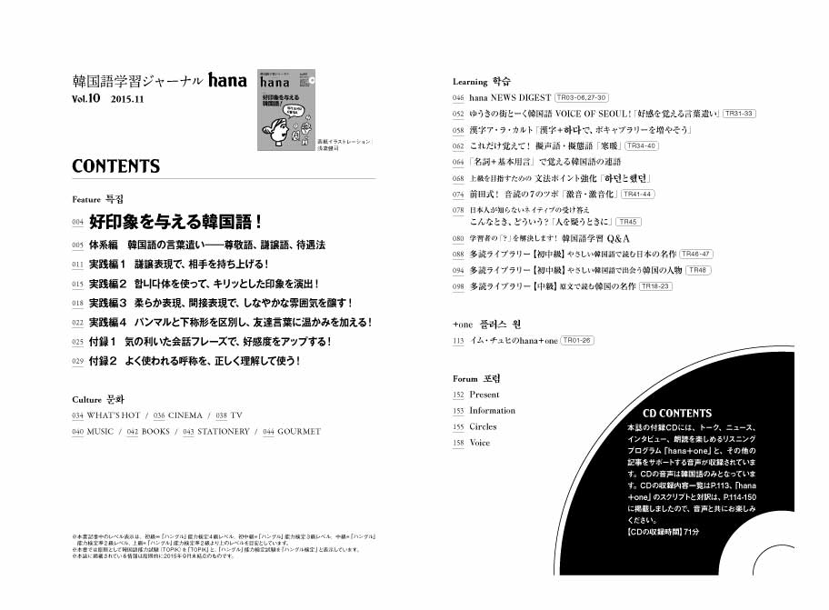 今号の特集は「好印象を与える韓国語」。韓国の敬語法、待遇法について確認したうえで、かしこまった丁寧体、柔らか表現、控えめ表現などの洗練された話し方について、さらには温かみを感じさせる友達言葉の使い方などについて学びます。また、相手を褒める、ねぎらうなどの好感度が高いフレーズ集や、どういう相手をどう呼べばいいか(呼称)についても学ぶことができます!